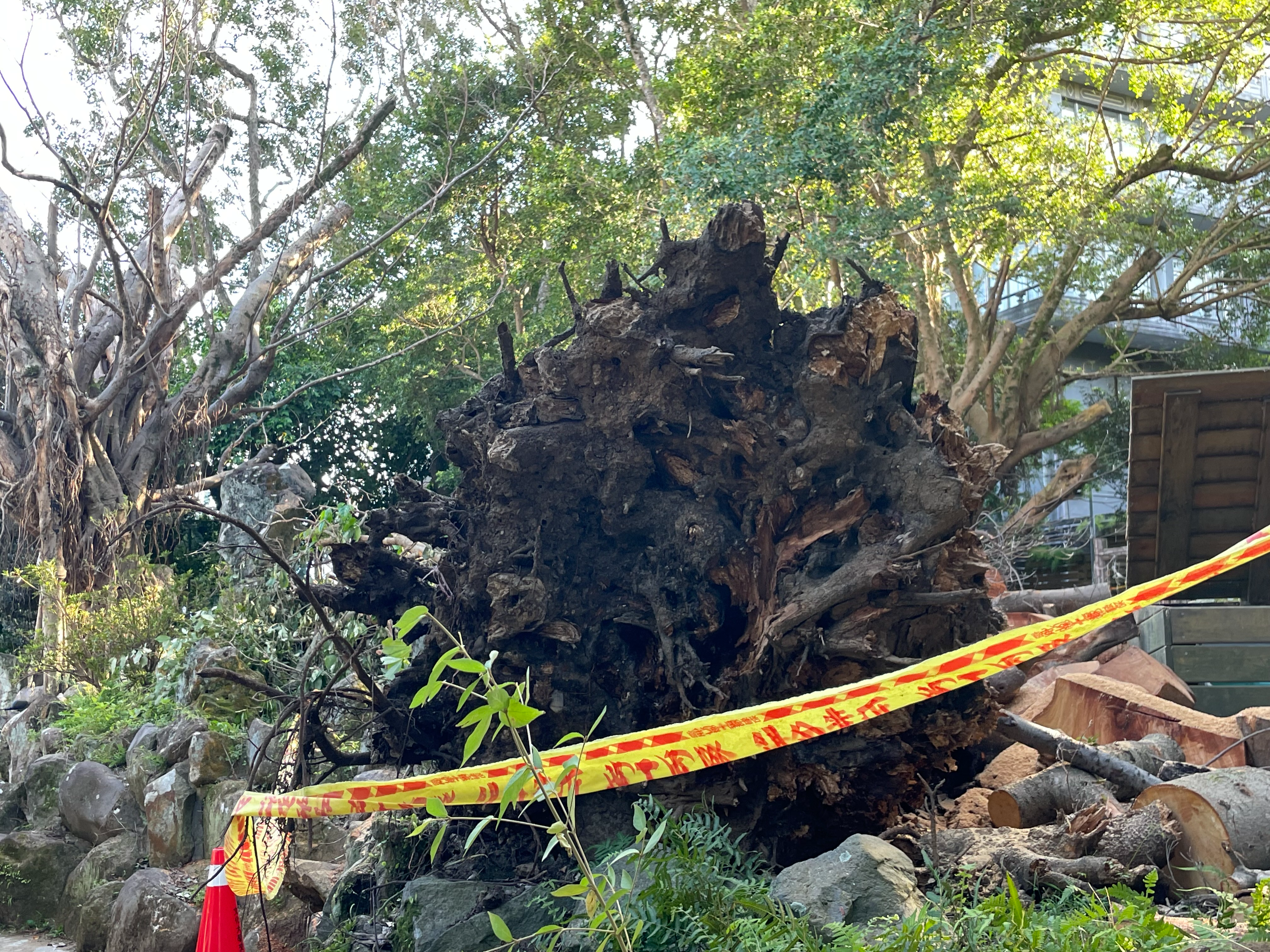 ▲位於文化大學大成館前方大樹因褐根病加上颱風雨而倒塌。 攝|童韋宣