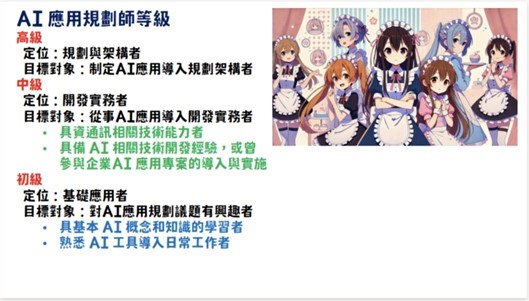 ▲AI應用規劃師總共分為初、中、高級,初級適用所有人;中級適用工程師;高級則適用老板。(圖片來源:鄒忠毅提供)