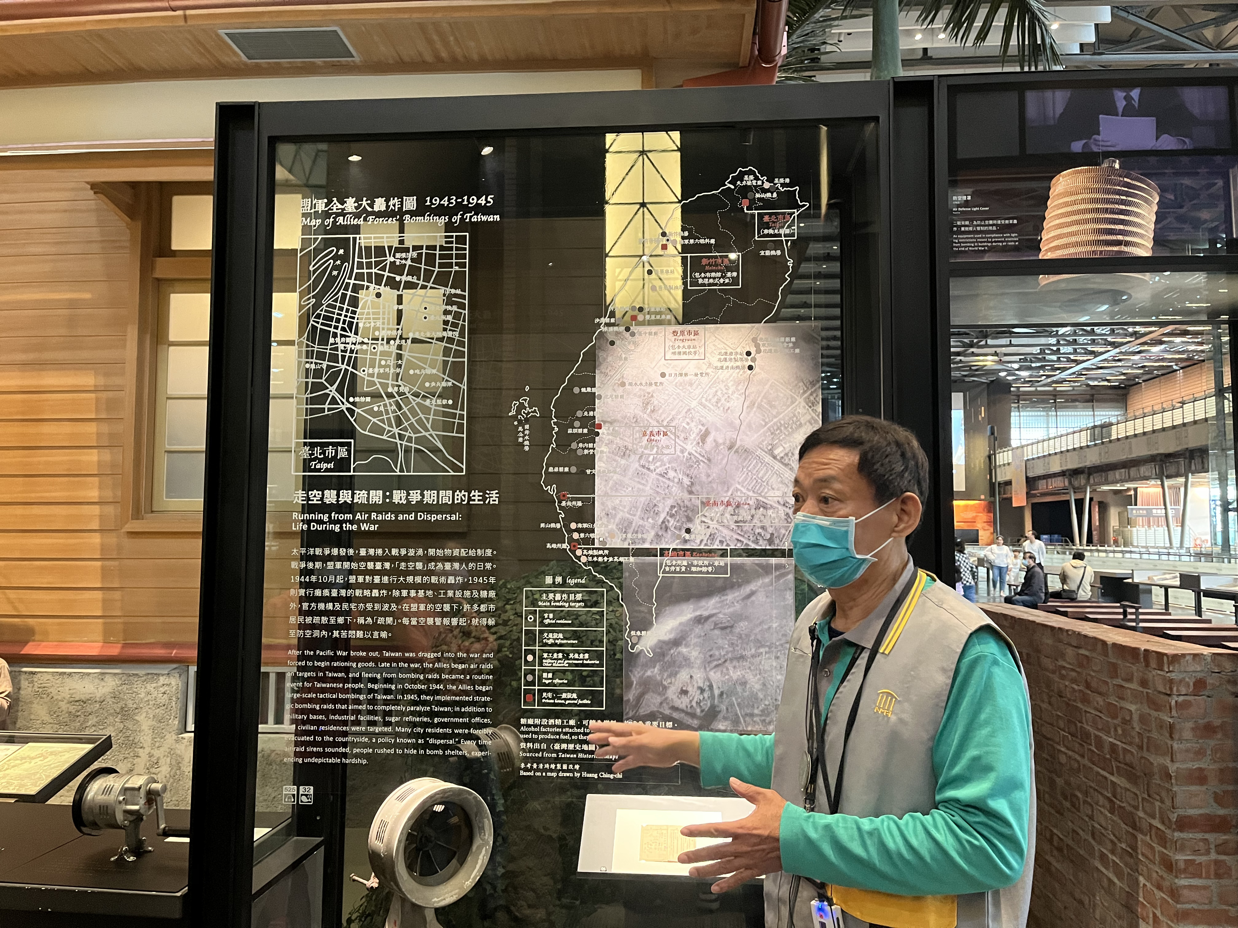 ▲導覽員錢志華解說盟軍全臺大轟炸圖,帶領觀眾走入歷史記憶。攝|黃筠珊