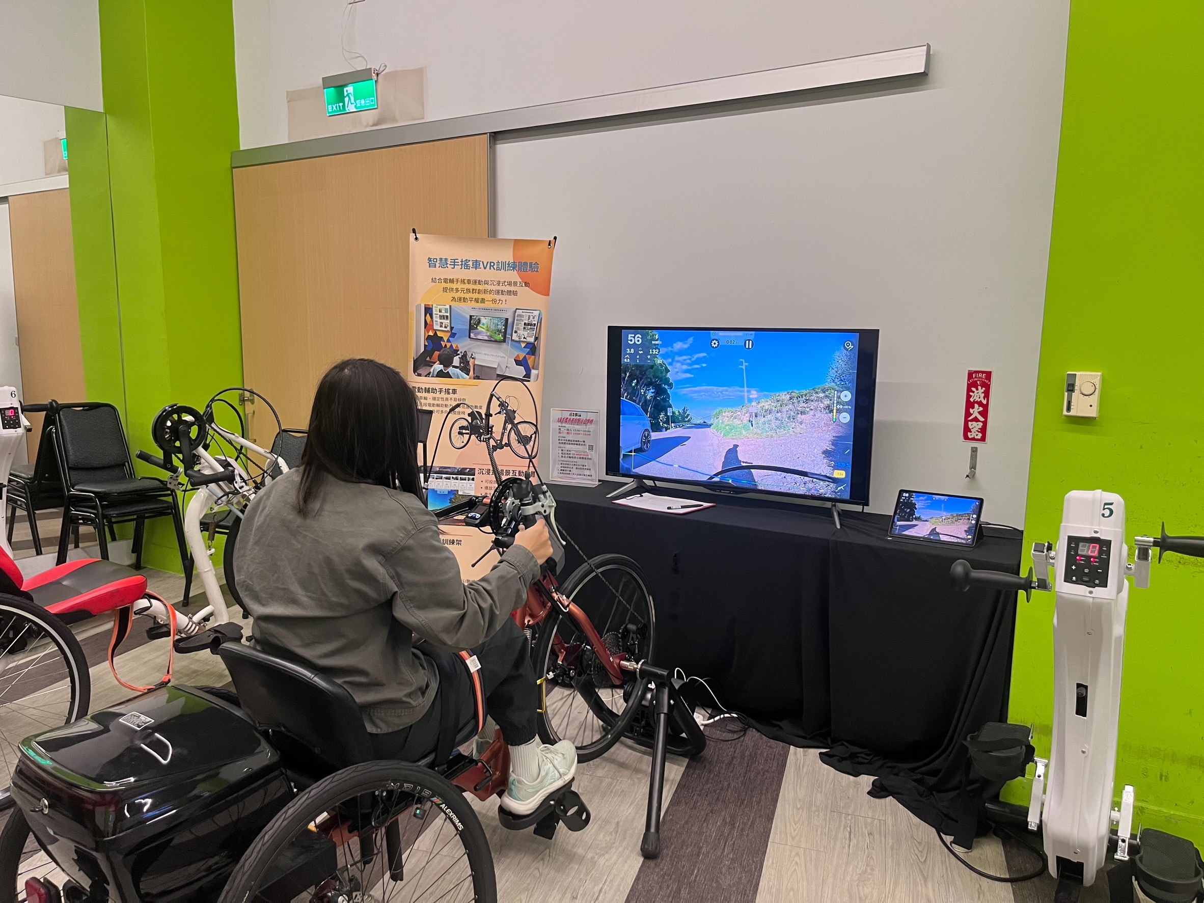 ▲在輪椅夢公園聯盟的健身房內提供智慧手搖車,結合AR,在室內也能身歷其境,同時能訓練手部肌肉。攝|黃瑛