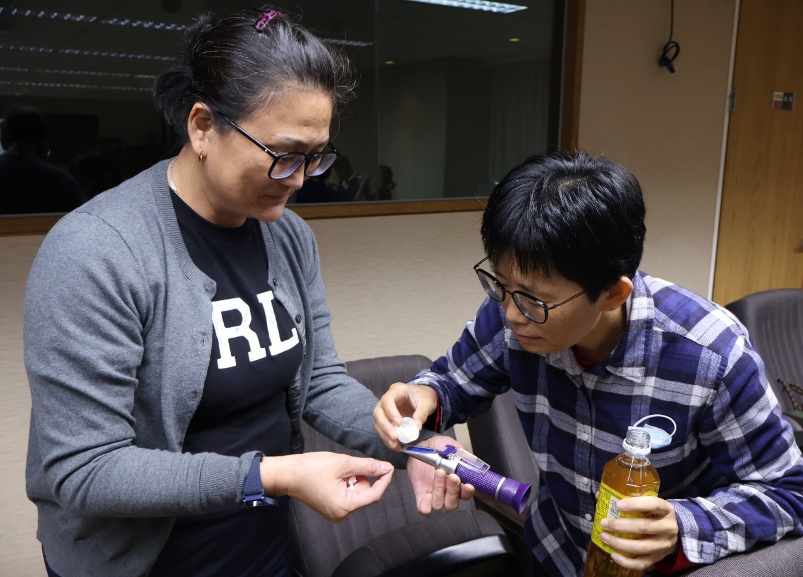 ▲文大樂齡大學學員希望藉由課堂所學,知道家人的飲食是否健康及安全。圖為學員進行糖度檢測。 攝|劉維新